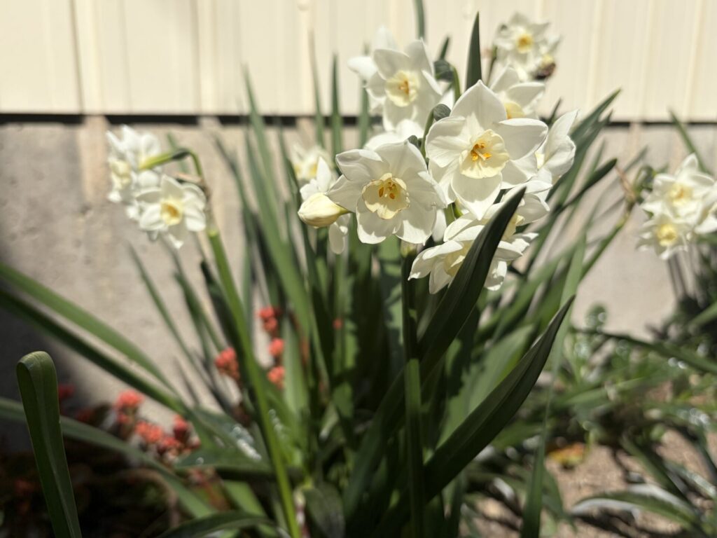 毎年この季節に、会社の裏庭にひっそりと咲くスイセンの花 とても綺麗です いよいよ春が近いなぁと、心も和らいできます